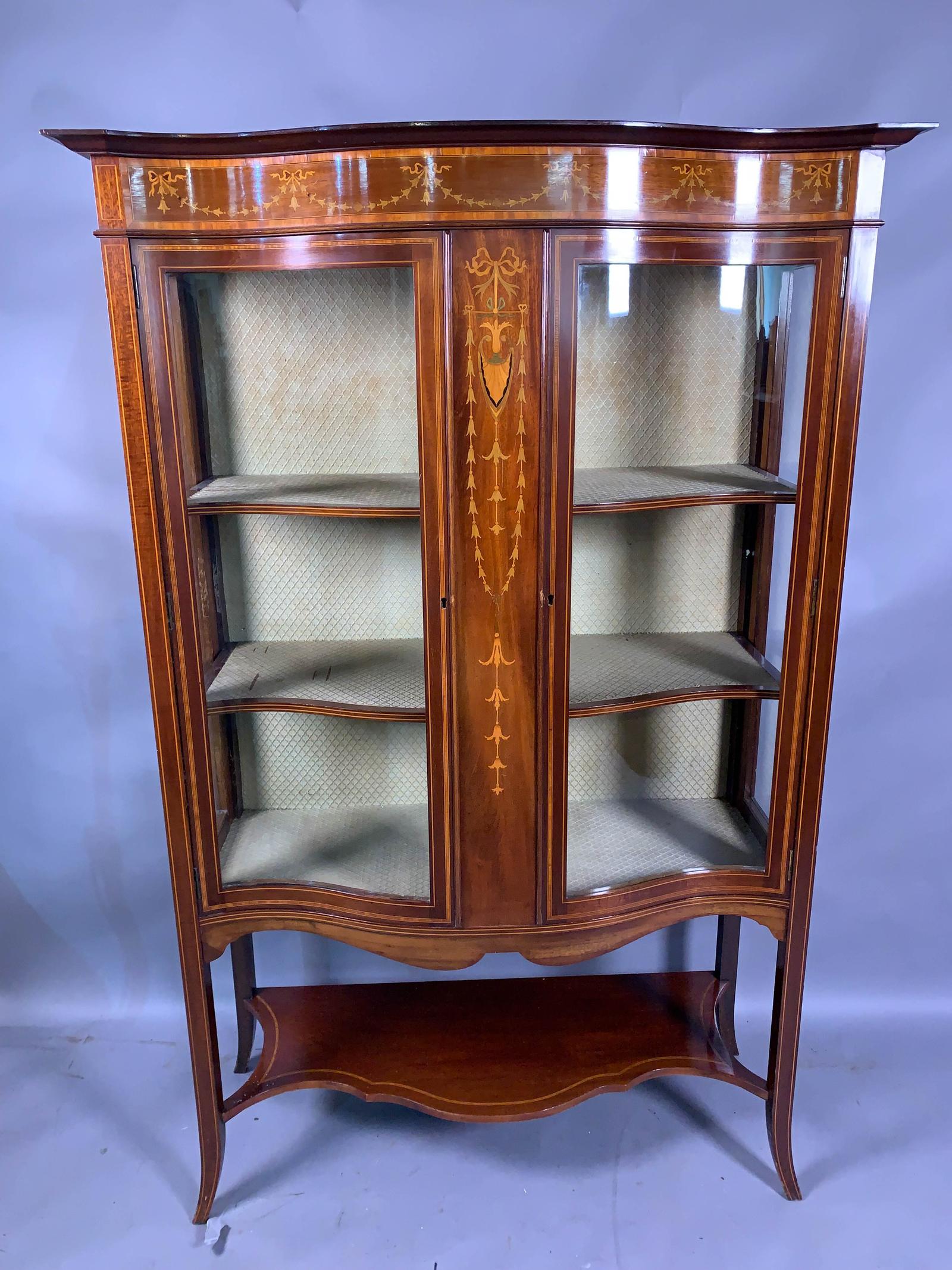 Late Victorian Mahogany with Inlay Serpentine Shape Display Cabinet
