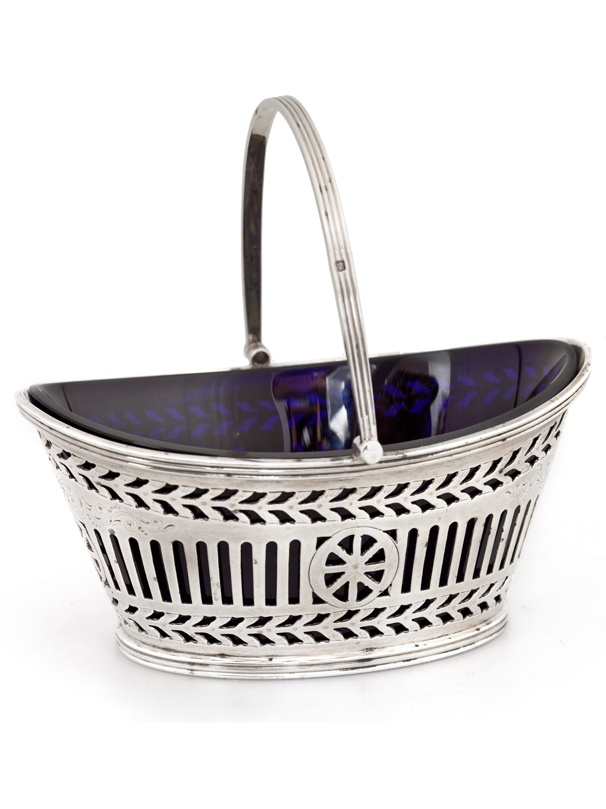 Late Victorian Silver Copy of a George III Oval Blue Glass Lined Sugar Basket (1 of 1)