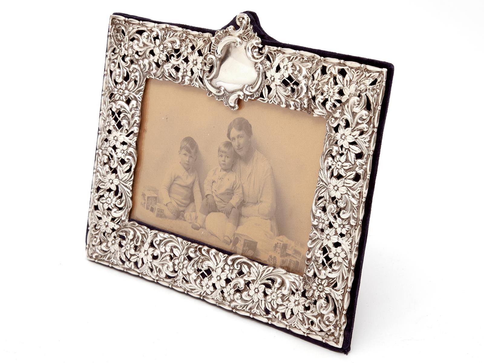 Late Victorian Silver Photo Frame Embossed and Pierced with Scrolls and Floral Scenes