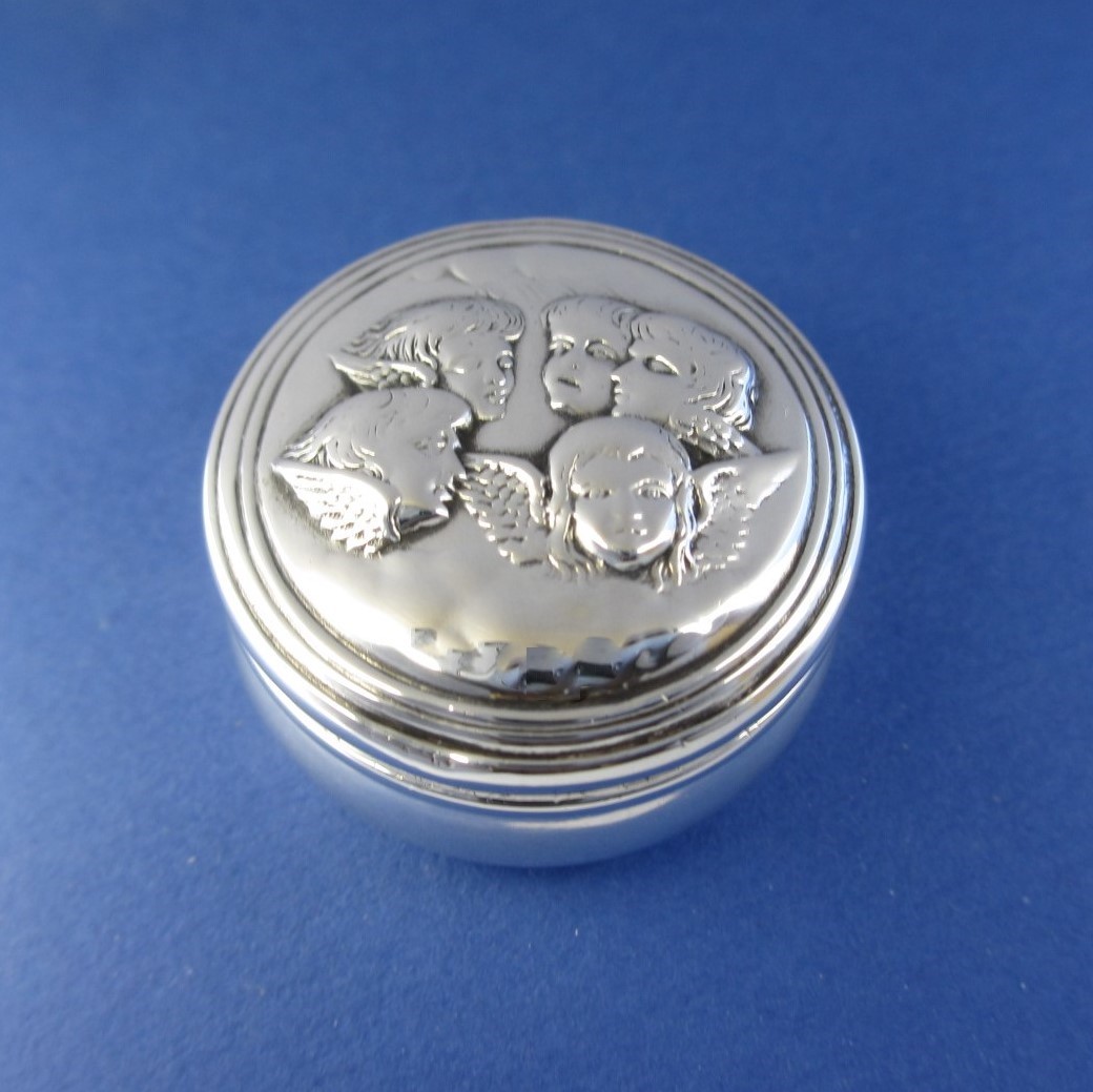 Late Victorian Silver Pill Box Featuring Joshua Reynolds Angels