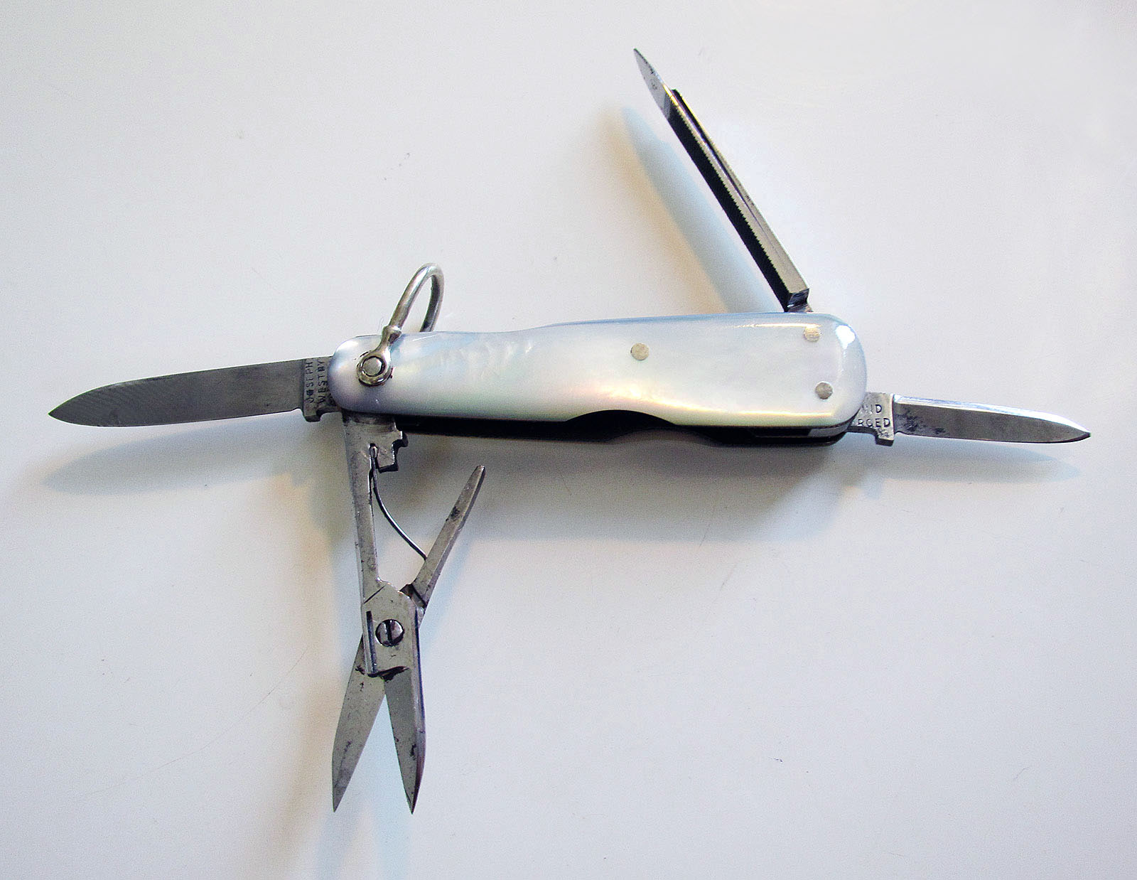 Leather Case Quality Miniature Mother of Pearl Stainless Steel Folding Lobster Sportsman Pen Knife Fruit Penknife C.1920