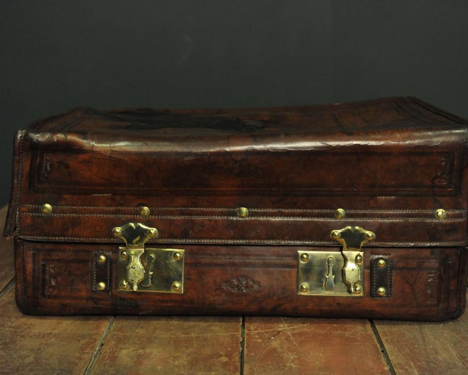 Leather trunk with engravings on the top and two massive brass clasps
