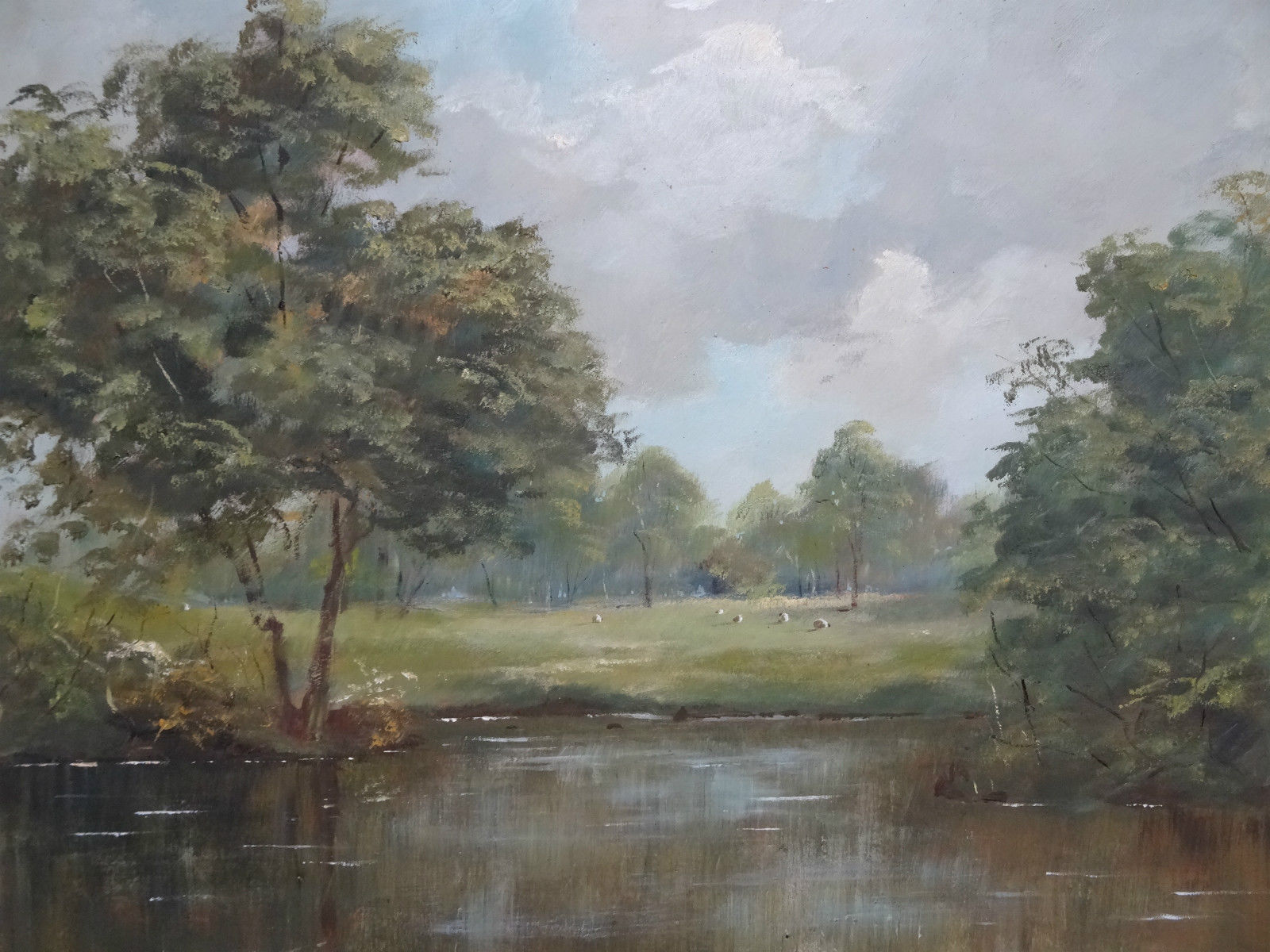 Lewis Creighton Sheep in Rural River Landscape Oil Painting - Superb