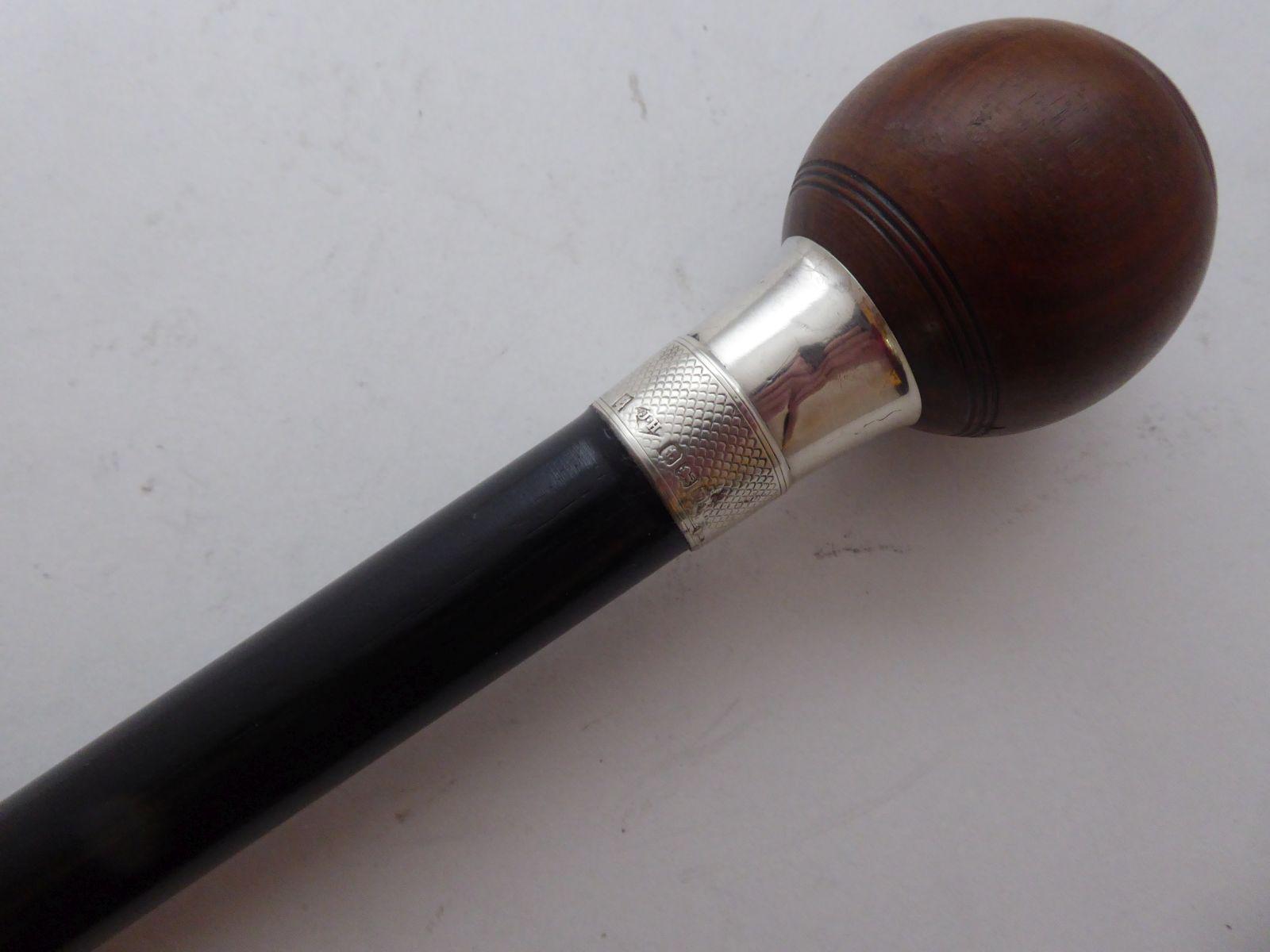 Lignum Vitae Bowling Ball Walking Stick 1920 Solid Silver Collar Ebony Shaft