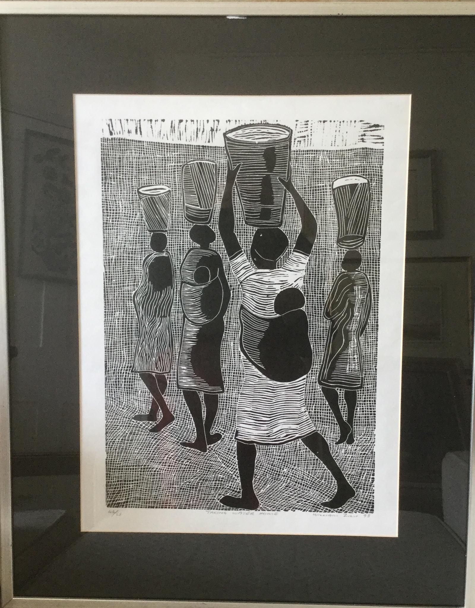 Linocut by South African Artist William Zulu. Titled Carrying Water Home