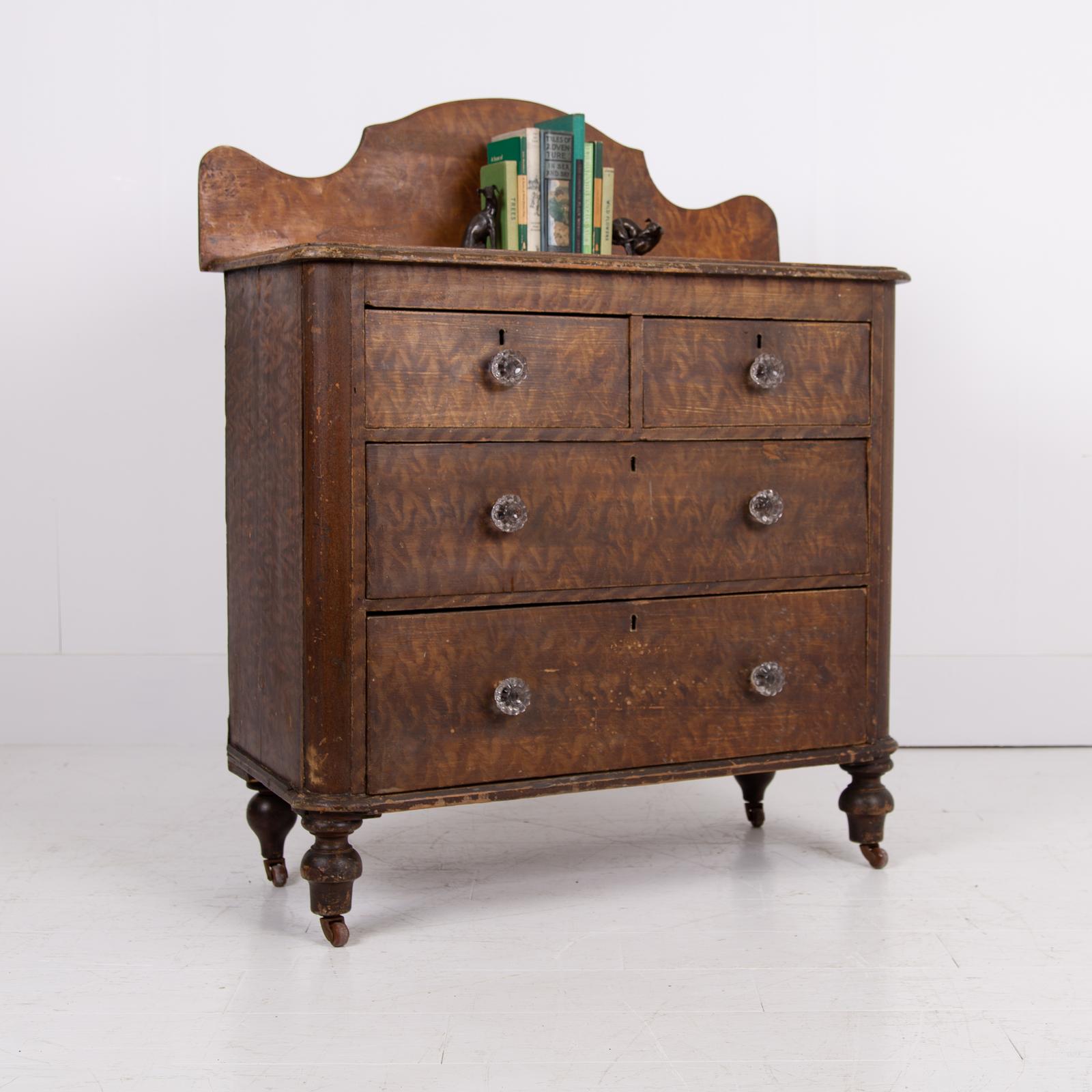 A delightful little Victorian country chest of drawers sitting in the original paint - we love the look, scale and condition on this one. The style is classic country Victorian with the drawer combo of 2 half drawers and 2 long drawers with glass knobs sitting underneath all perched on those lovely turned legs and little pot castors. Colour wise we have a caramel, toffee mix to all parts, an interesting attractive pattern and a grainy worn finish. The piece sits well with genuine wear, the drawers are a little worn and we have ensured its ready to place with clean drawers etc. Easy to find a spot for this little beauty English C1880. Dimensions Overall: Height 86cm with Gallery 112cm at Centre x Width 94.5cm x Depth 40.5cm Drawer Inners: Height from Top Down, Top Two 12.5cm, 17.5cm & 20.5cm x Width 73.5cm x Depth 28.5cm When purchasing from us we include delivery in the purchase price which is based on a one person delivery for England and Wales. Please call or email for quotes to Scotland, Northern Ireland, The Isles and for World-wide shipping. Please see our delivery page for details.