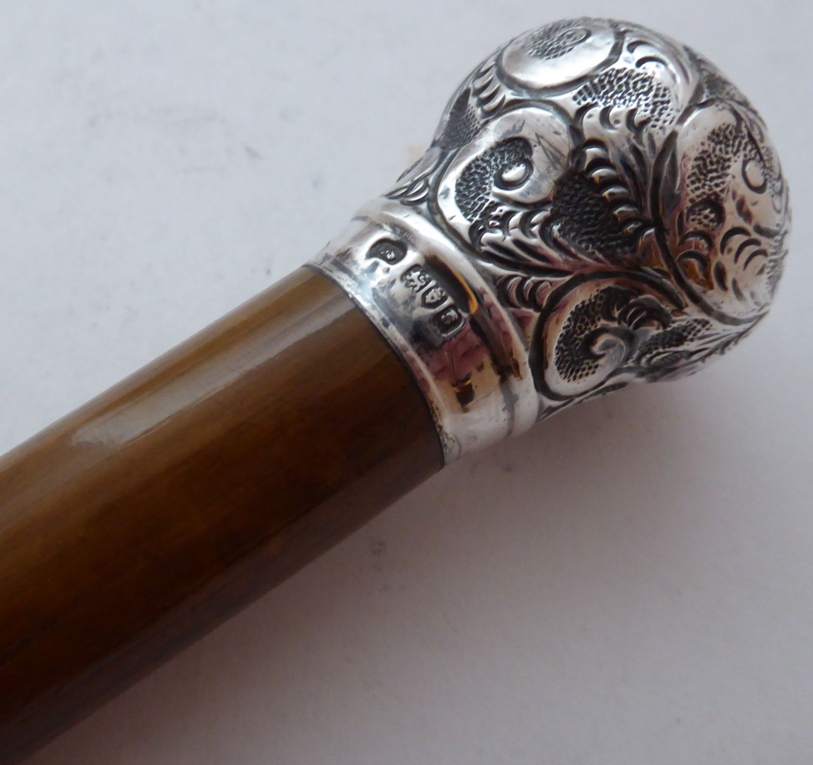 London 1913 Walking Stick Cane Hallmarked Solid Silver Pommel Malacca Shaft