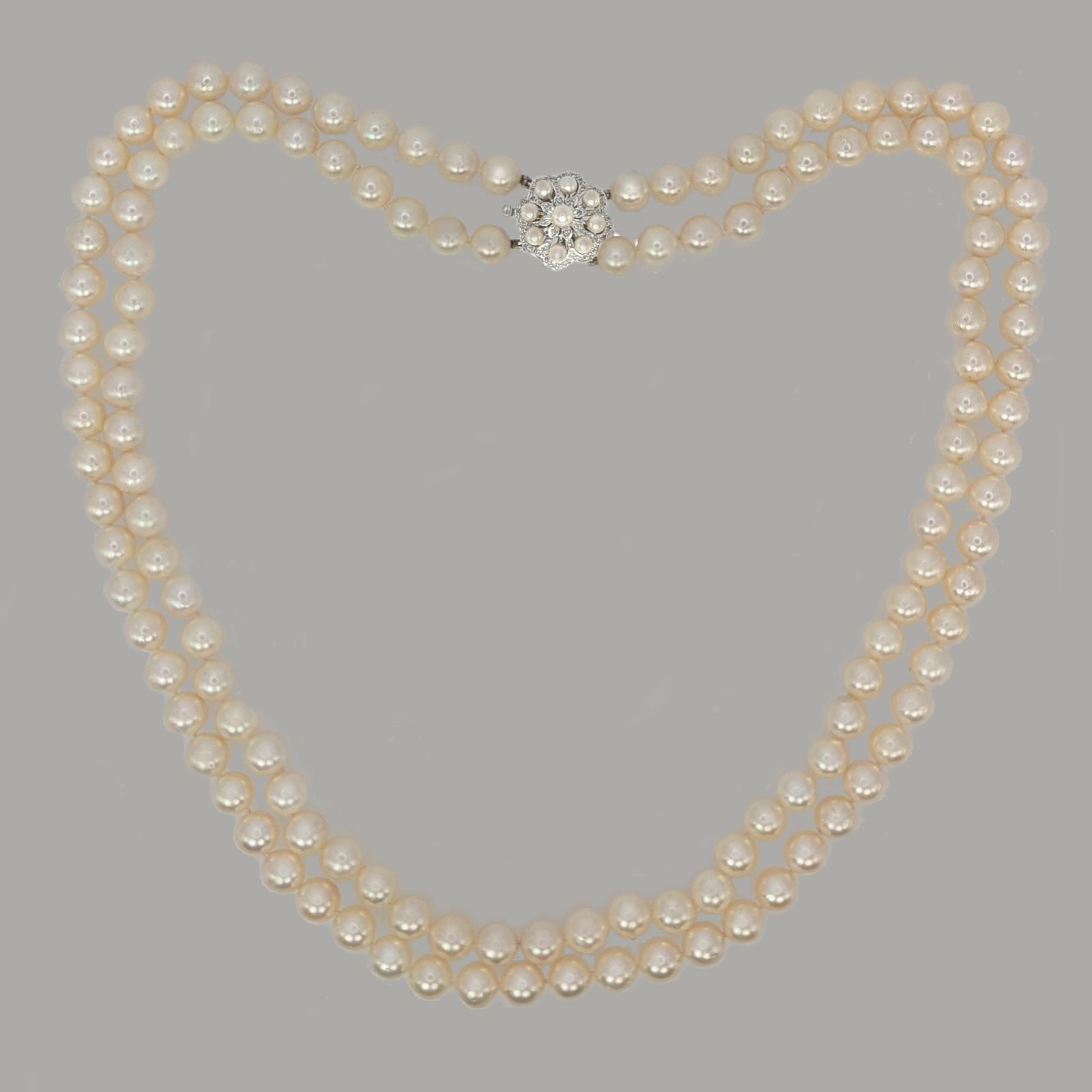 Long Double Strand Pearl Necklace with Diamond 9ct Gold Clasp 9mm Pearls 1960s