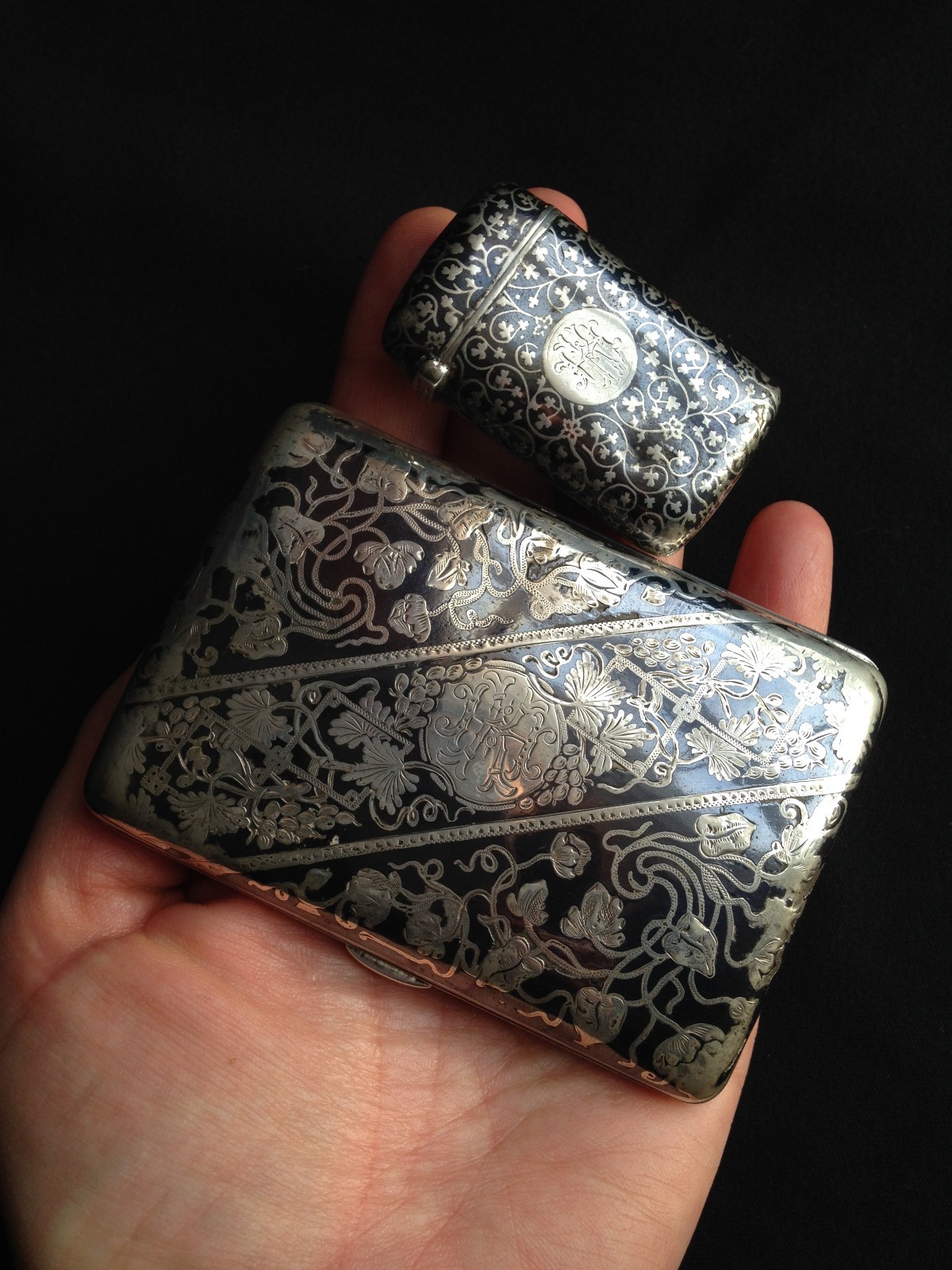 Lot of Two 2 X Antique Rare Finest Austrian Solid Silver Niello Cigarette & Vesta Cases