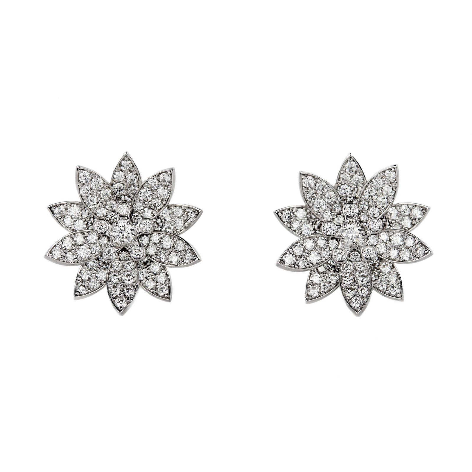 Lotus Earrings, White Gold with Diamonds, in the Form of Blossoming Lotus Flowers.