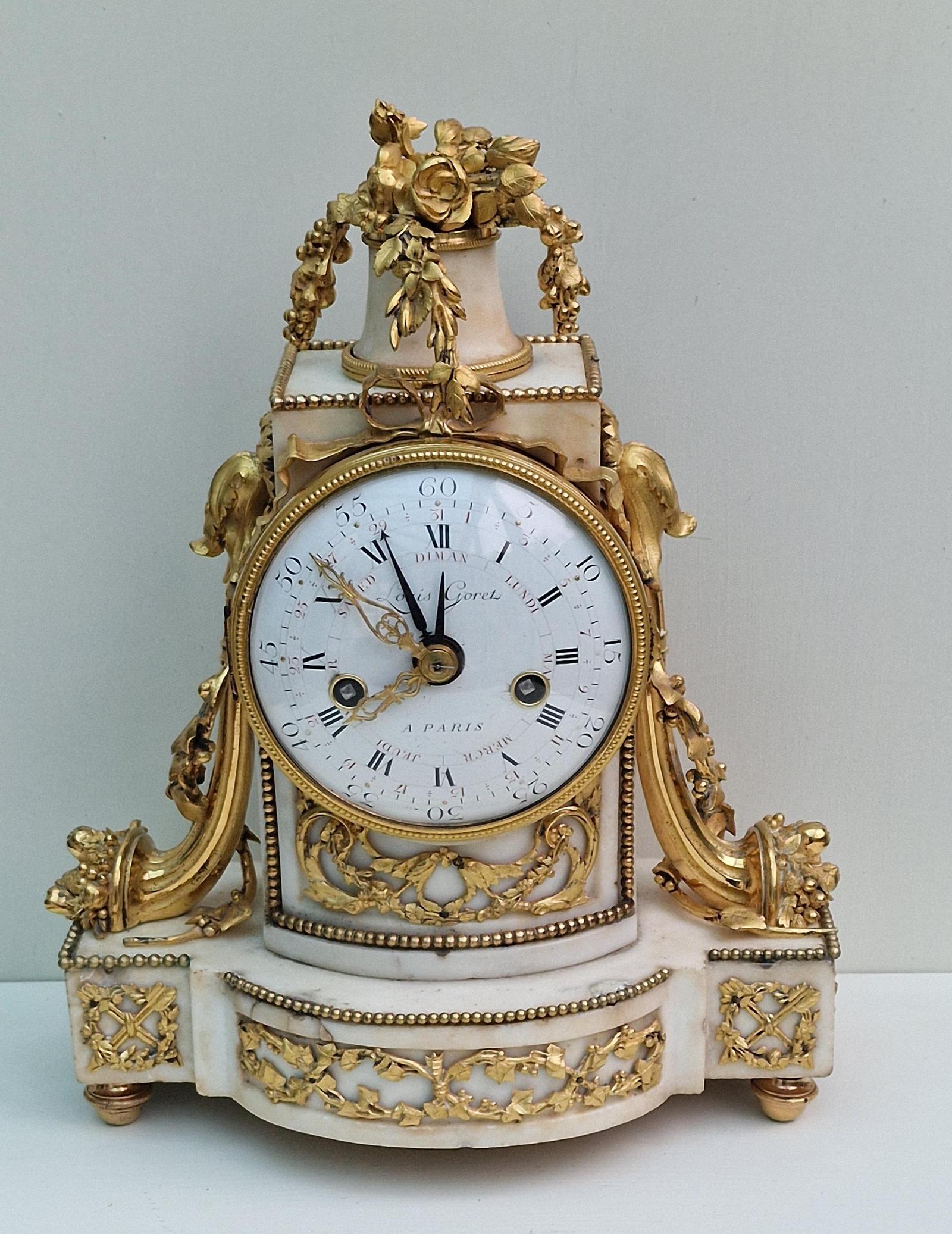 An important Louis XV period French mantel clock by Louis Goret of Paris. A white marble case with ormolu case mounts. A Floral cascading basket to the pediment. Fretted gilt mounts to the front and base and standing on adjustable feet.