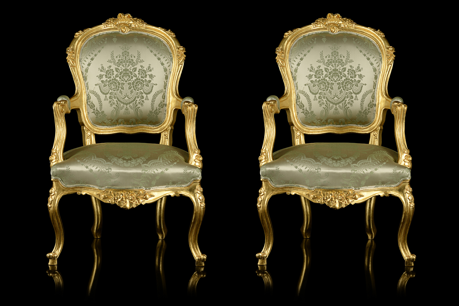 Louis XV 24ct Gold-Leaf Gilded Fauteuils Armchairs Upholstered in Silk Damask