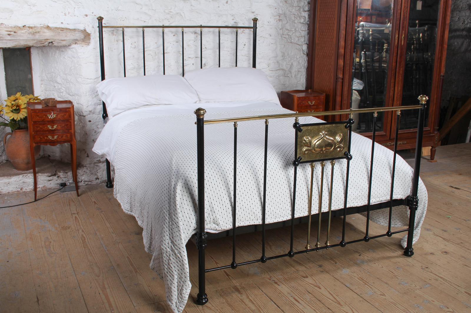 A very nice double bed with brass top rail on the head and foot. Nicely shaped Ed caps at the top of all 4 posts and very sweet little brass rod ends at the top of each iron upright. The central brass detail on the foot has a classic art nouveaux style pomegranate detail which has been pressed into the brass and hammer chased.