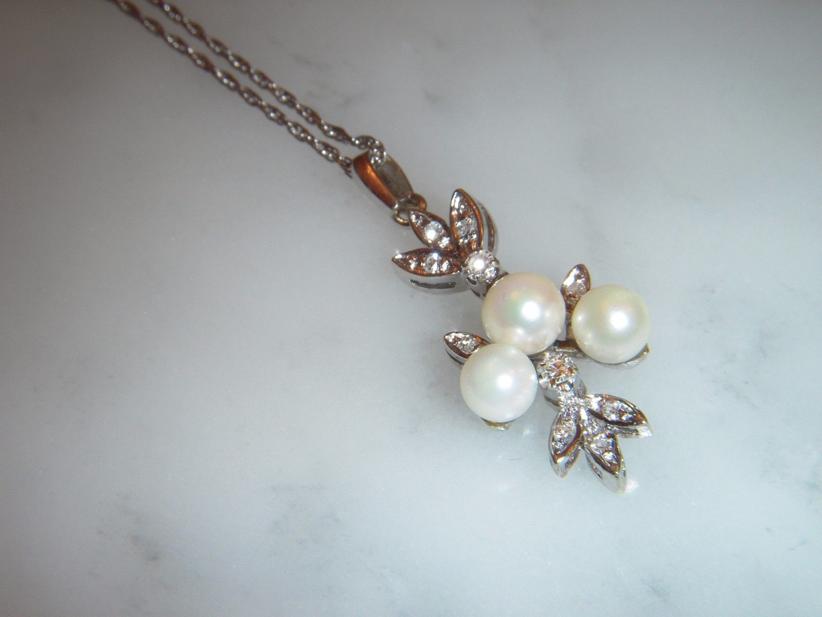 Lovely Art Deco 18ct White Gold Diamond & Cultured Pearl Pendant & Chain