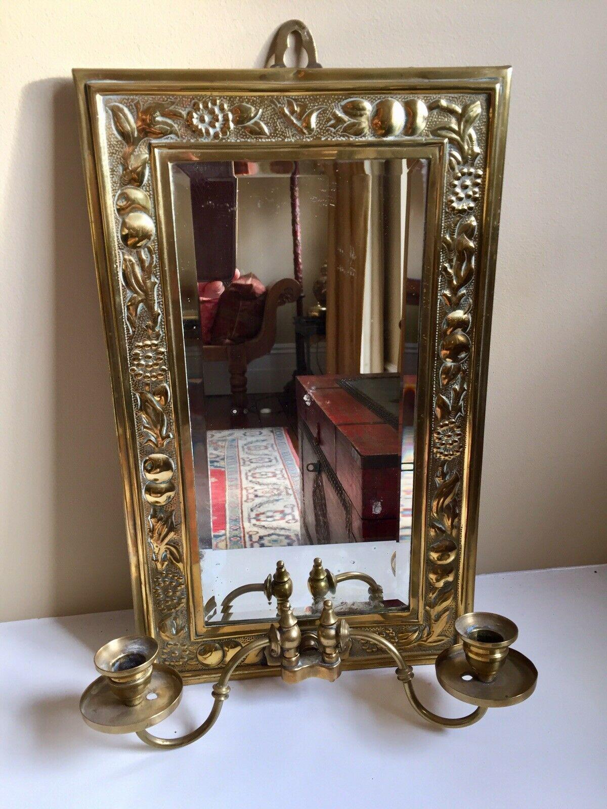 Lovely Arts & Crafts Brass Repousse Mirror Candle Wall Sconce