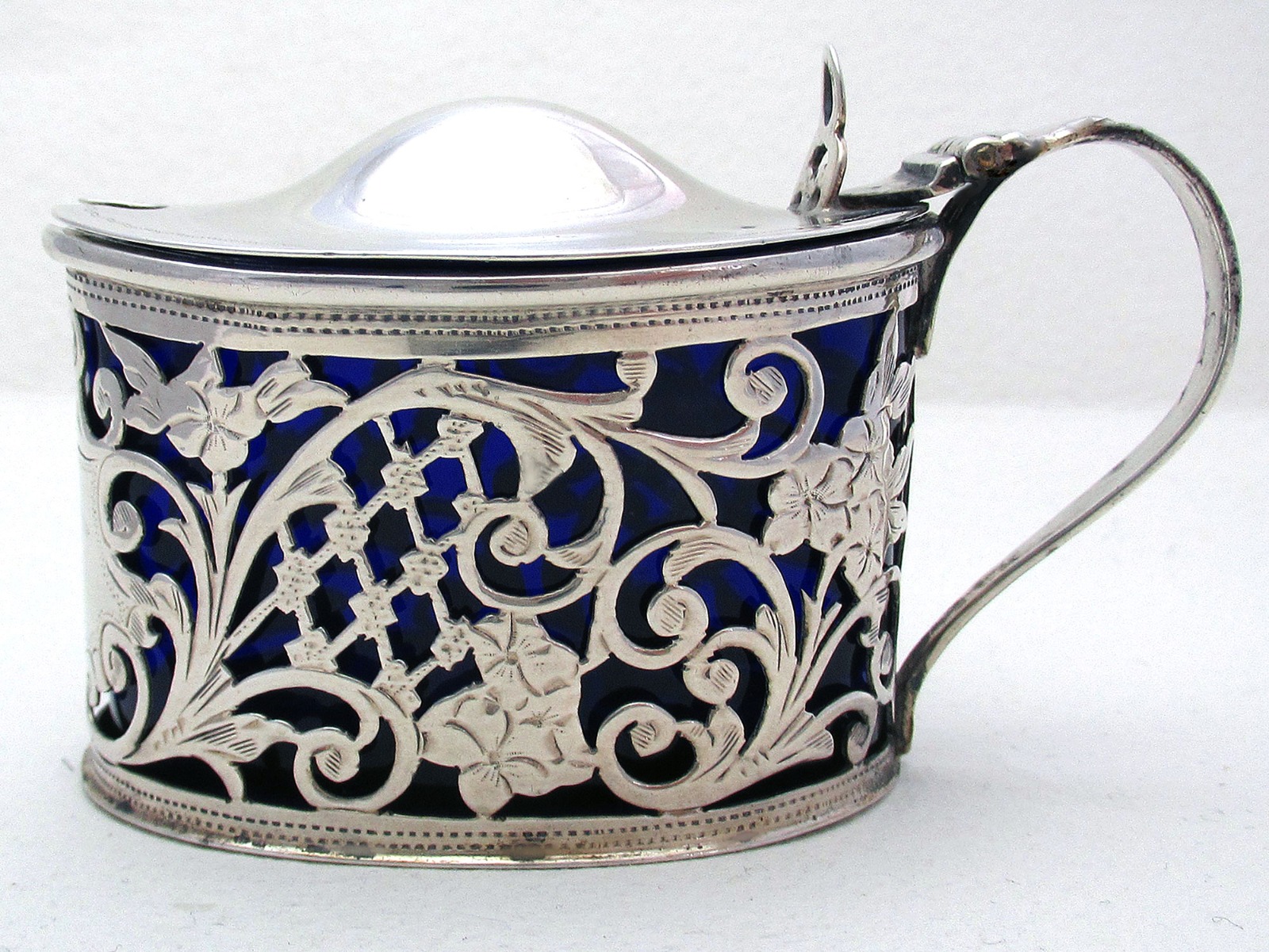 Lovely Chester Pierced Solid Sterling Silver & Bristol Blue Glass Liner Antique Mustard Pot Cruet, Edwardian English 1913 Hallmarked
