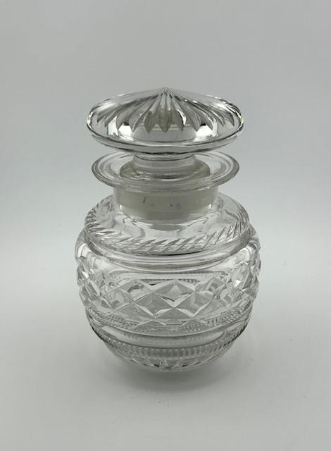 A gorgeous cut glass pickle or preserve jar, dating from the elegant Edwardian era. The body is rounded and extensively cut with diamond and notch bands. The base is cut with a multipoint star. The rim is flared and the stopper is of mushroom form with star cutting, echoing the base. A lovely and practical gift idea, with some home-made preserves.