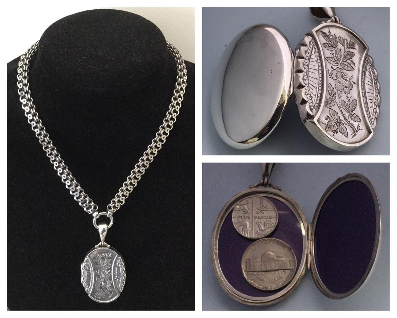 Lovely 'Floral' Design Victorian Silver Locket Hallmarked Birmingham 1881 On Superb Collar