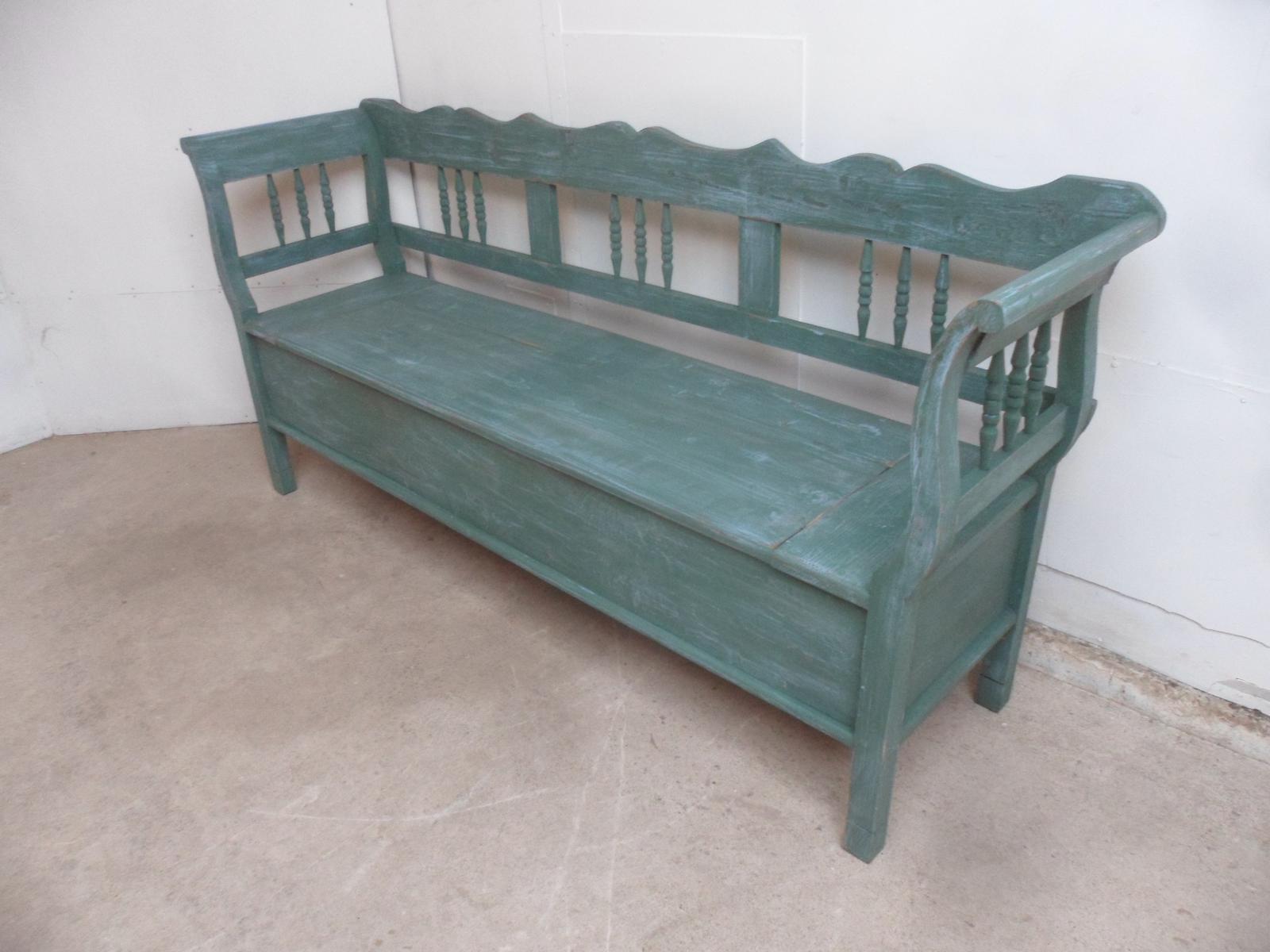 Lovely Green & Blue 3 Seater Antique Pine Kitchen / Hall Box Settle / Bench