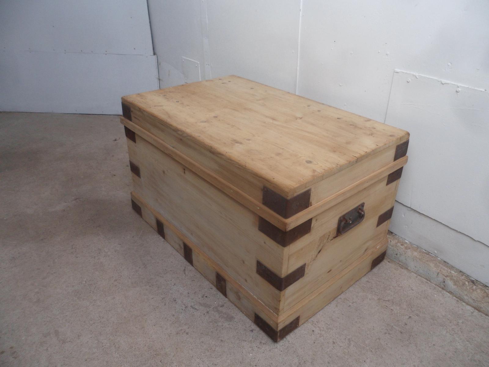 Lovely Metal Bound Victorian Antique Old Pine Coffer Box to Wax / Paint