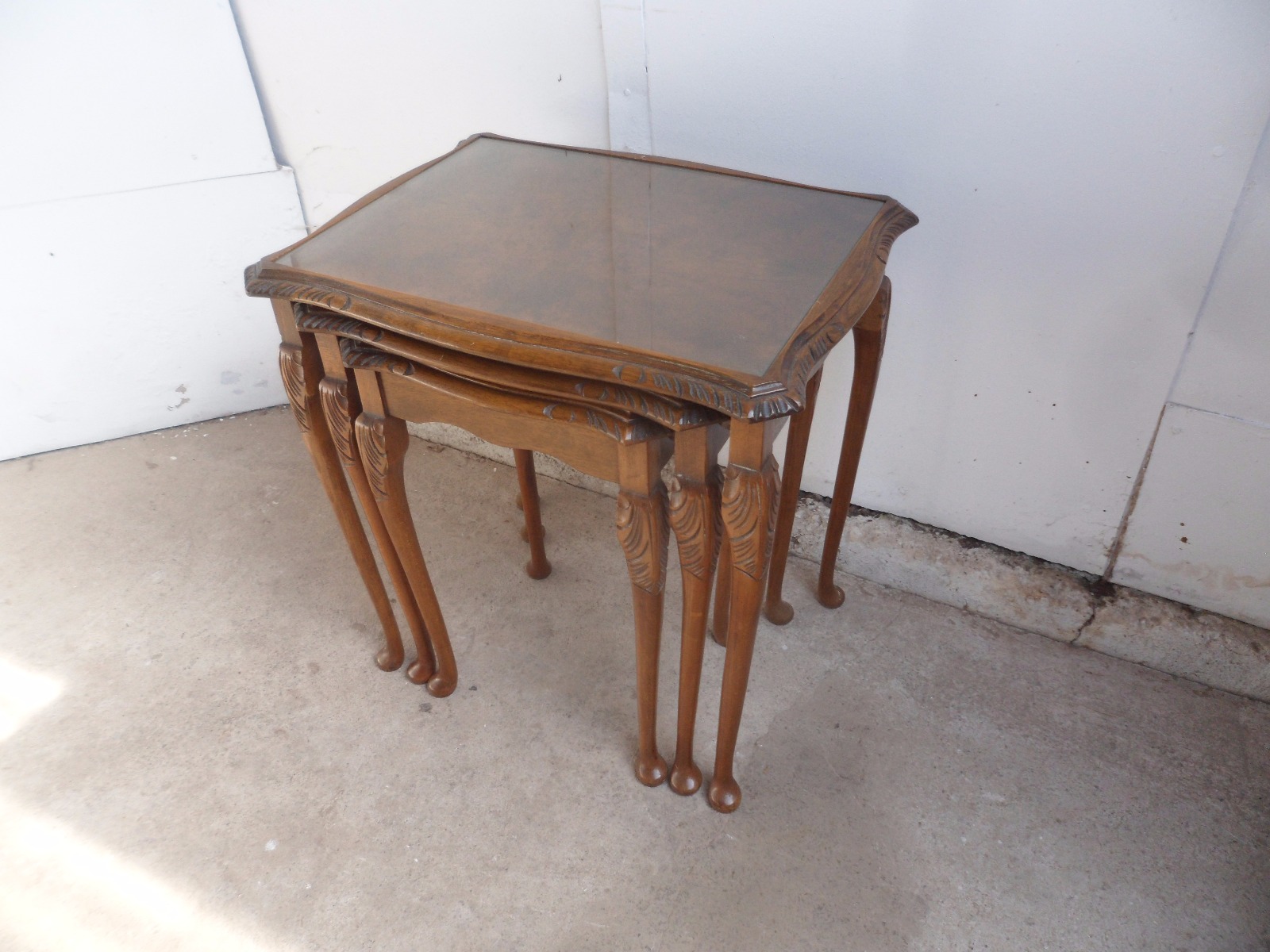 Lovely Nest of 3 Burr Walnut Carved Coffee Tables