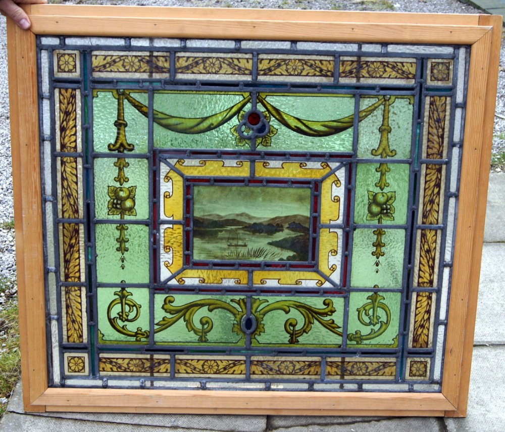 Lovely Painted Window Depicting a Lakeland Scene c.1900