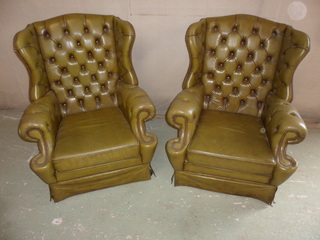 Lovely Pair of Light Green Button Back Leather Armchairs