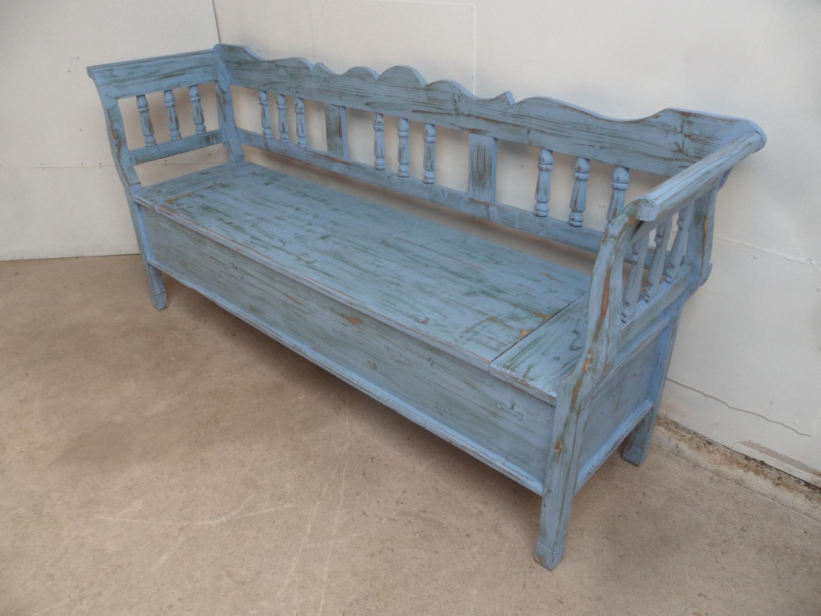 Lovely Sky Blue 3 Seater Antique Pine Kitchen / Hall Box Settle / Bench