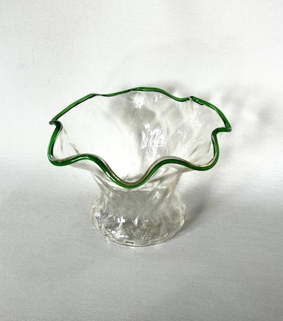 A lovely glass vase in the Art Nouveau taste and probably by Stuart & Sons. The body is decorated with honeycomb ribbing and has a wrythen shape. The flared rim is undulating and has an applied green rim. An eye-catching display piece with a practical use.