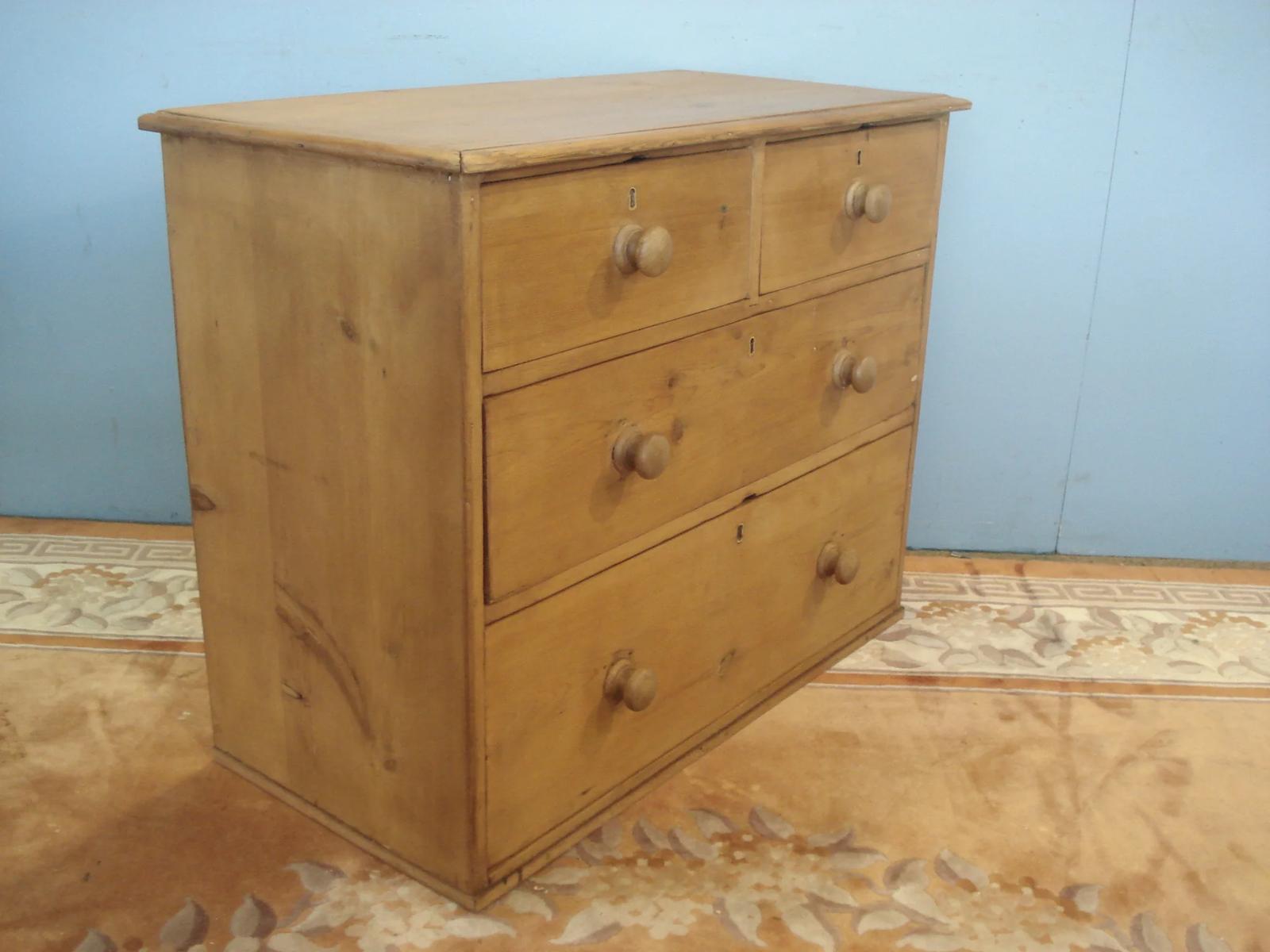 Low Four Drawer 19th Century Pine Chest with Deep Bottom Drawer