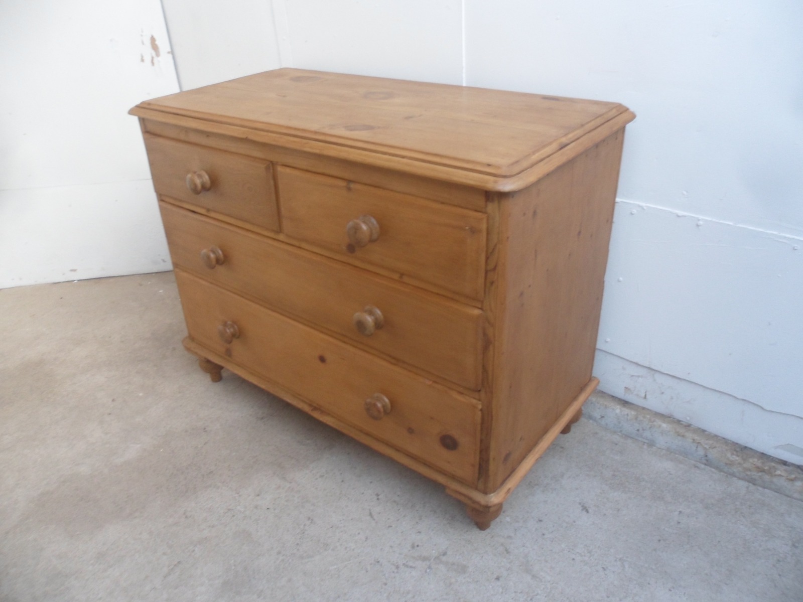 Low & Wide Waxed Victorian Antique Pine 4 Drawer Chest of Drawers