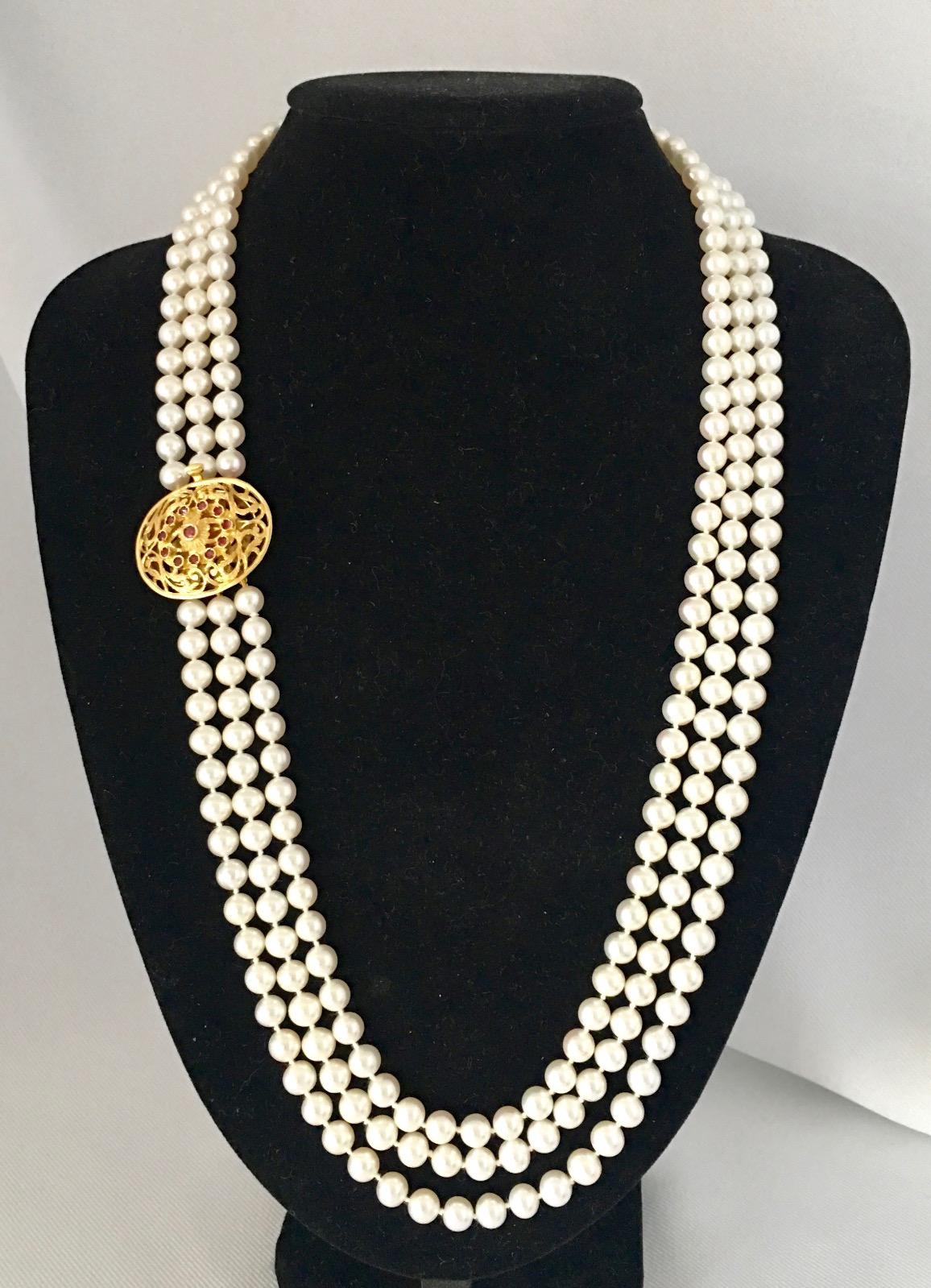 Luxurious 1960s Pearls with Ruby Set 18ct Clasp