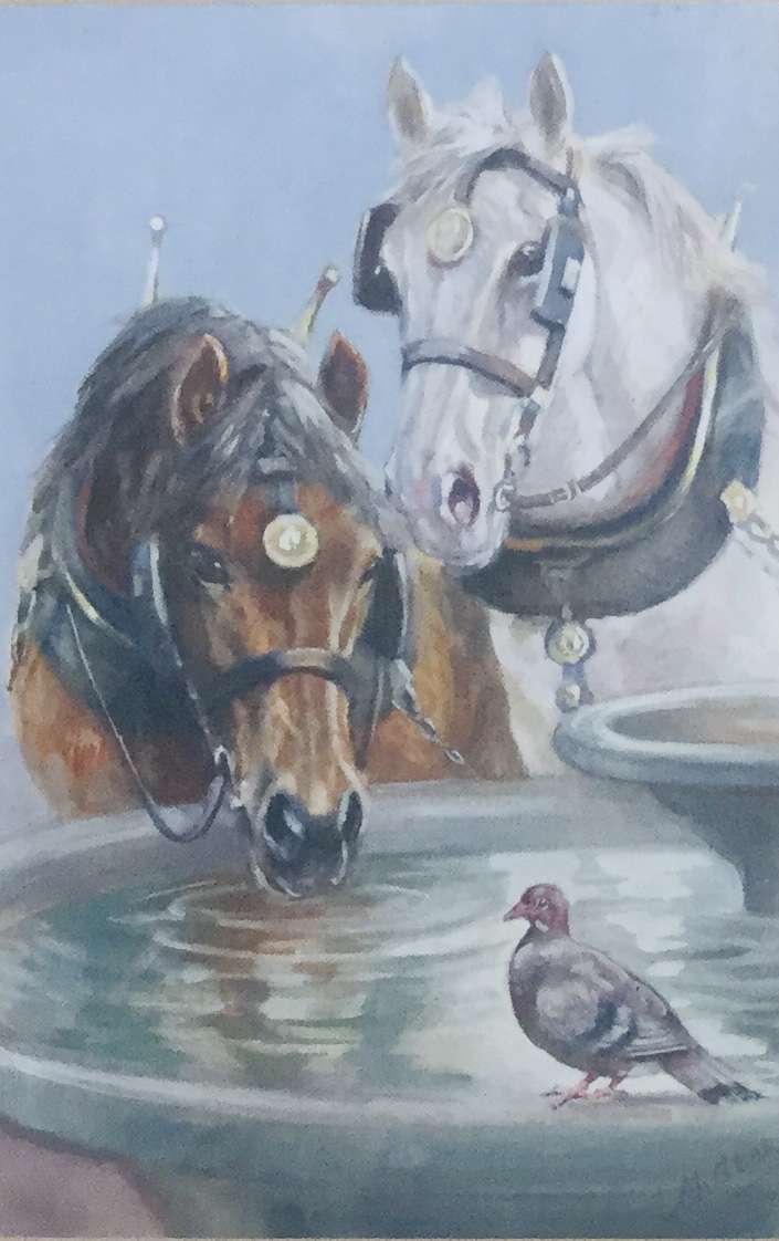 Mabel Gear Watercolour ‘ Two Horses and a Pigeon Drinking St a Fountain’