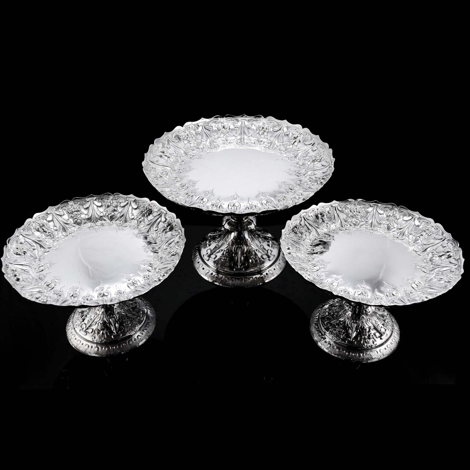 Magnificent Antique Set of Three Solid Sterling Silver Comport / Tazza Suites with Fine Chased Engravings - Martin Hall & Co 1890
