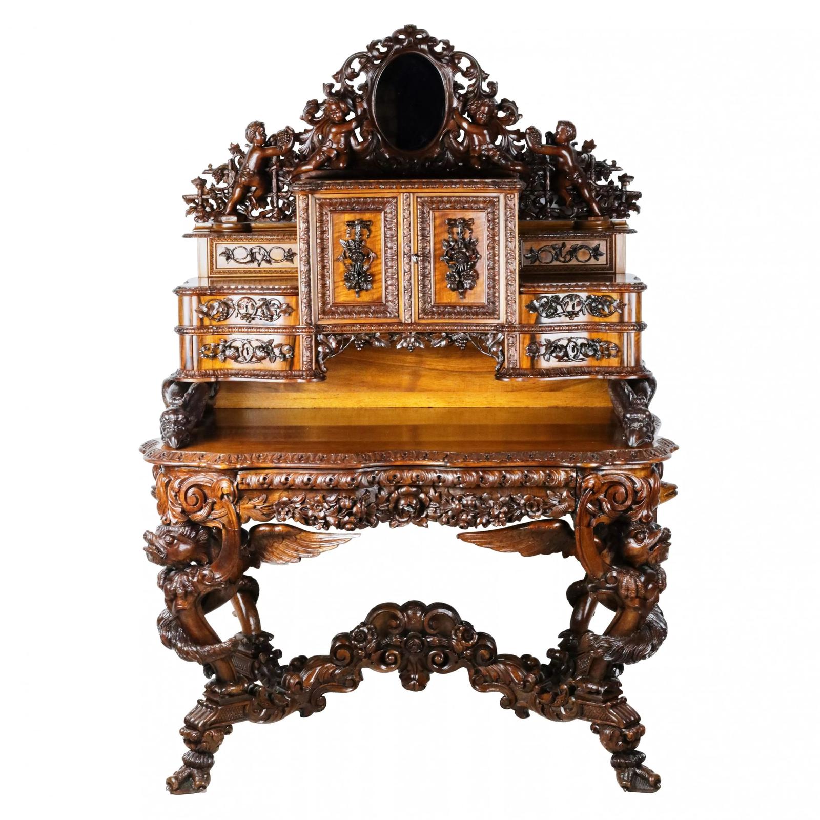 Magnificent Carved Bureau Table in the Baroque Neo-Gothic Style - France 19th Century