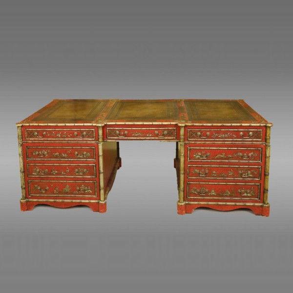 Magnificent large English library pedestal partners desk with chinoiserie decoration overall