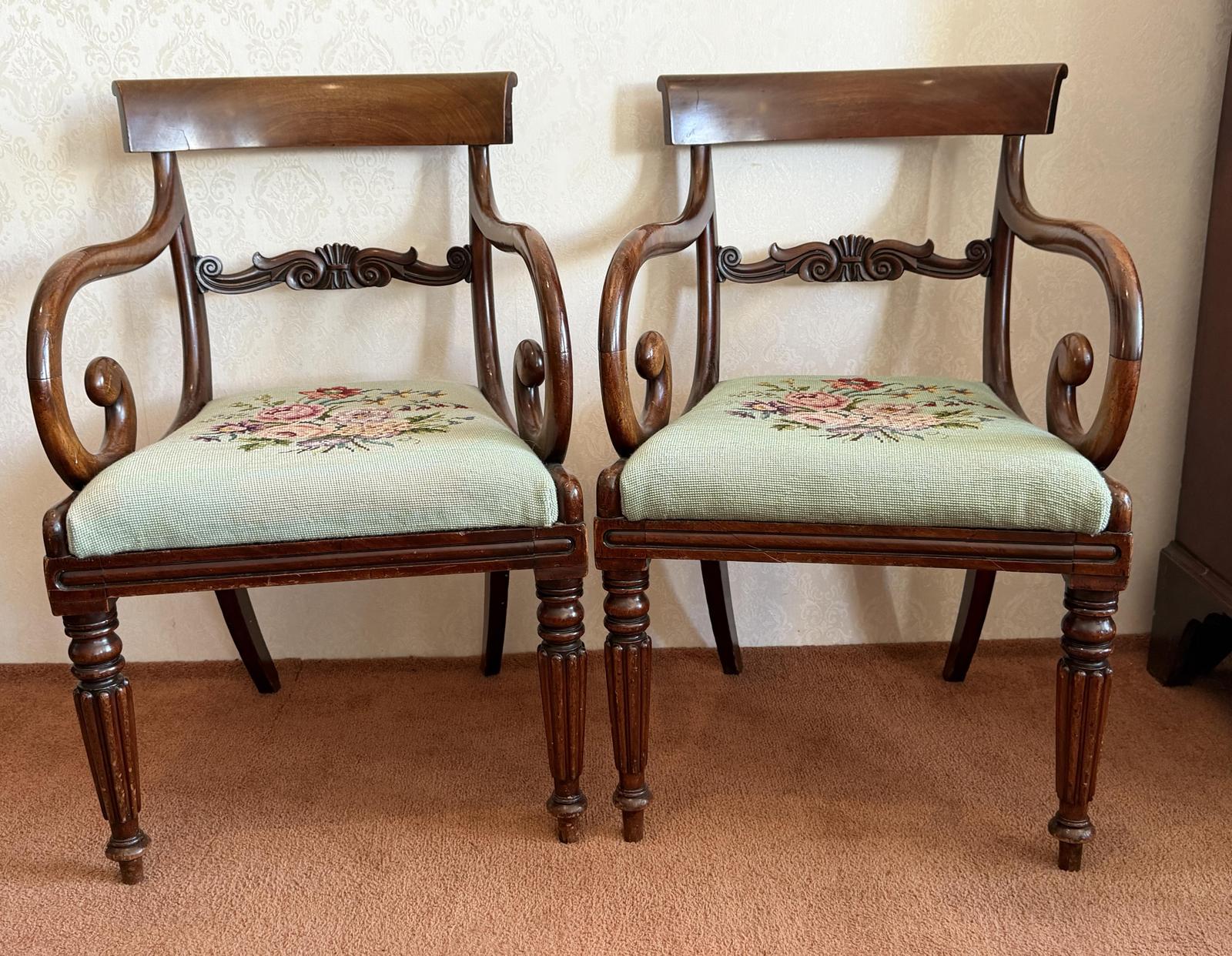 Magnificent pair of 19th Century (circa 1830) antique carver chairs in mahogany. Fine original condition. They both have turned flustered legs and drop in seats. Unrestored.