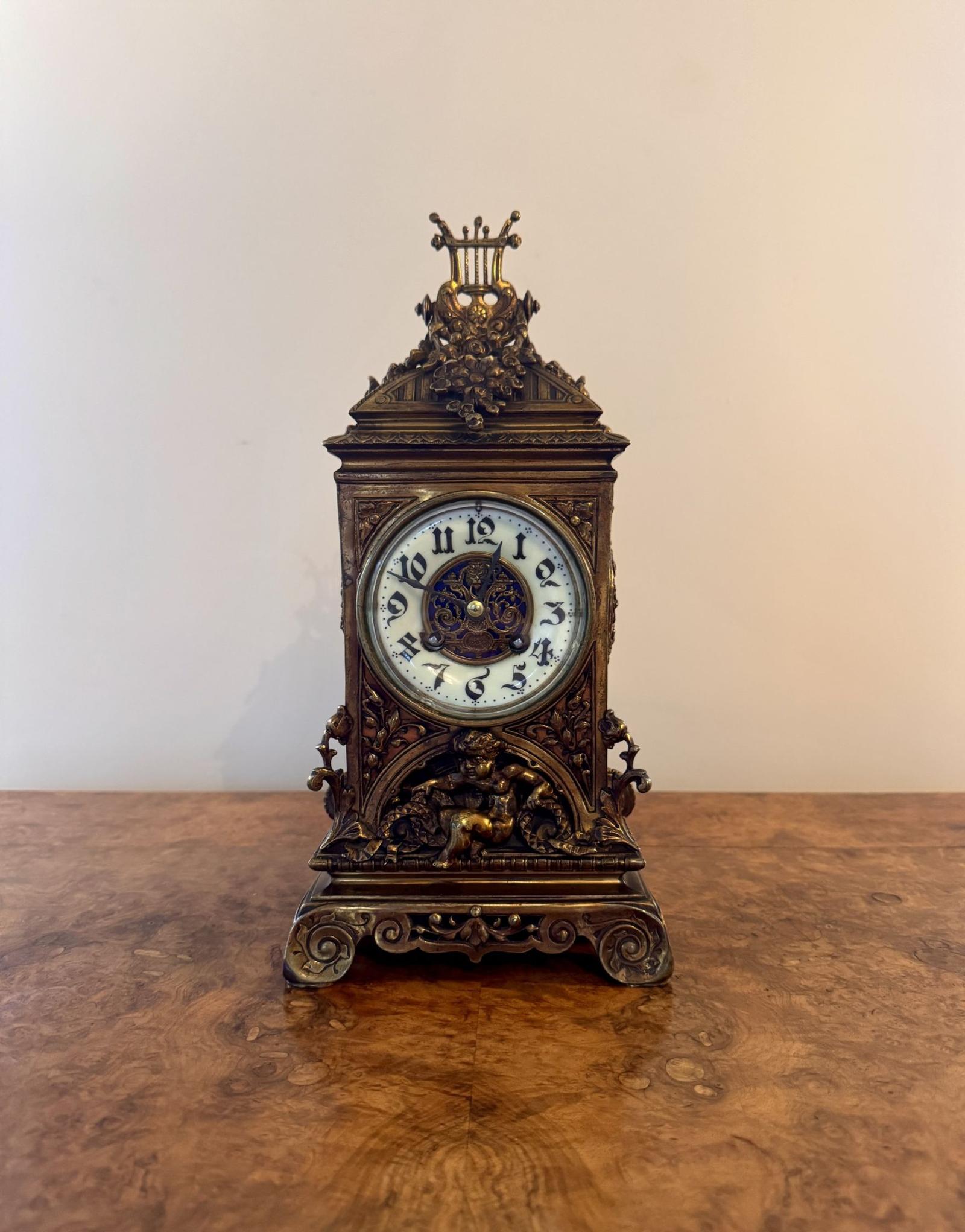 Magnificent quality antique Victorian ornate mantle clock, having a quality gilded brass rectangular shaped case with highly ornate detail with floral scrollwork & swags throughout, having a white enamel circular shaped dial to the centre of the case with black Arabic numerals and the original black spade hands with a decorative inner filigree around the centre of the dial, having a quality eight day movement striking the hour, below a seated cherub figure, to the top of the shaped case the clock is crowned with a crest surrounded by foliage, raised on shaped feet.
