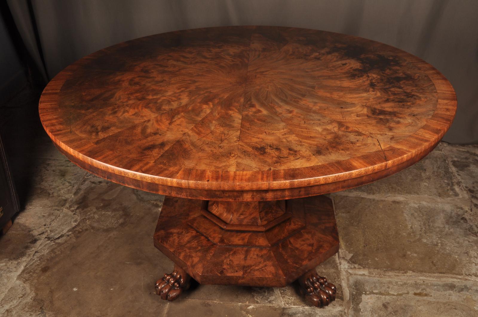 A truly magnificent Regency Breakfast Table made from extraordinary cuts of flame Mahogany veneers, having segmented circular top with cross banding to the edge. Standing on a beautifully made octagonal base with carved paw feet. In good original condition throughout.