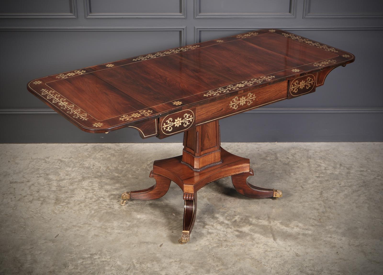 A superb Regency rosewood sofa table of exceptional quality, offered in excellent condition with a rich, warm patina and beautifully executed brass inlay throughout. The rectangular top features two drop flaps, each supported by brass-inlaid brackets front and back, allowing the table to extend when required. To the front is a single oak-lined frieze drawer with fine dovetailing, balanced by a dummy drawer to the reverse—making this an ideal freestanding centrepiece. The table stands on a tapering concave column with carved corner details, leading to a robust quadriform base and four out-swept legs, each finished with brass lion’s paw cup castors. A striking example of Regency craftsmanship, showcasing exceptional rosewood grain and intricate brasswork-an elegant and functional statement piece for any refined interior.