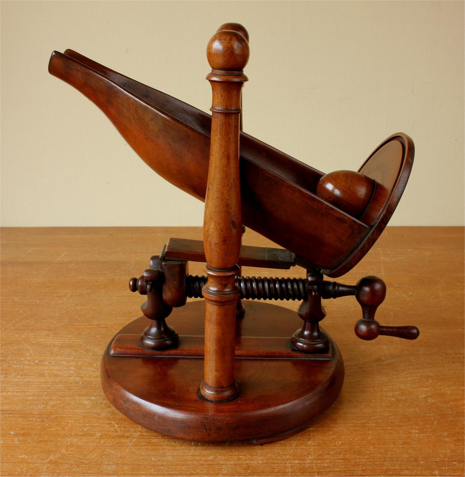 This rare Regency Period bottle holder has a clever design with all parts except for the brass hinges being made of wood including the winding thread with handle, bottle cradle with punt and sits on it's base which has three feet.