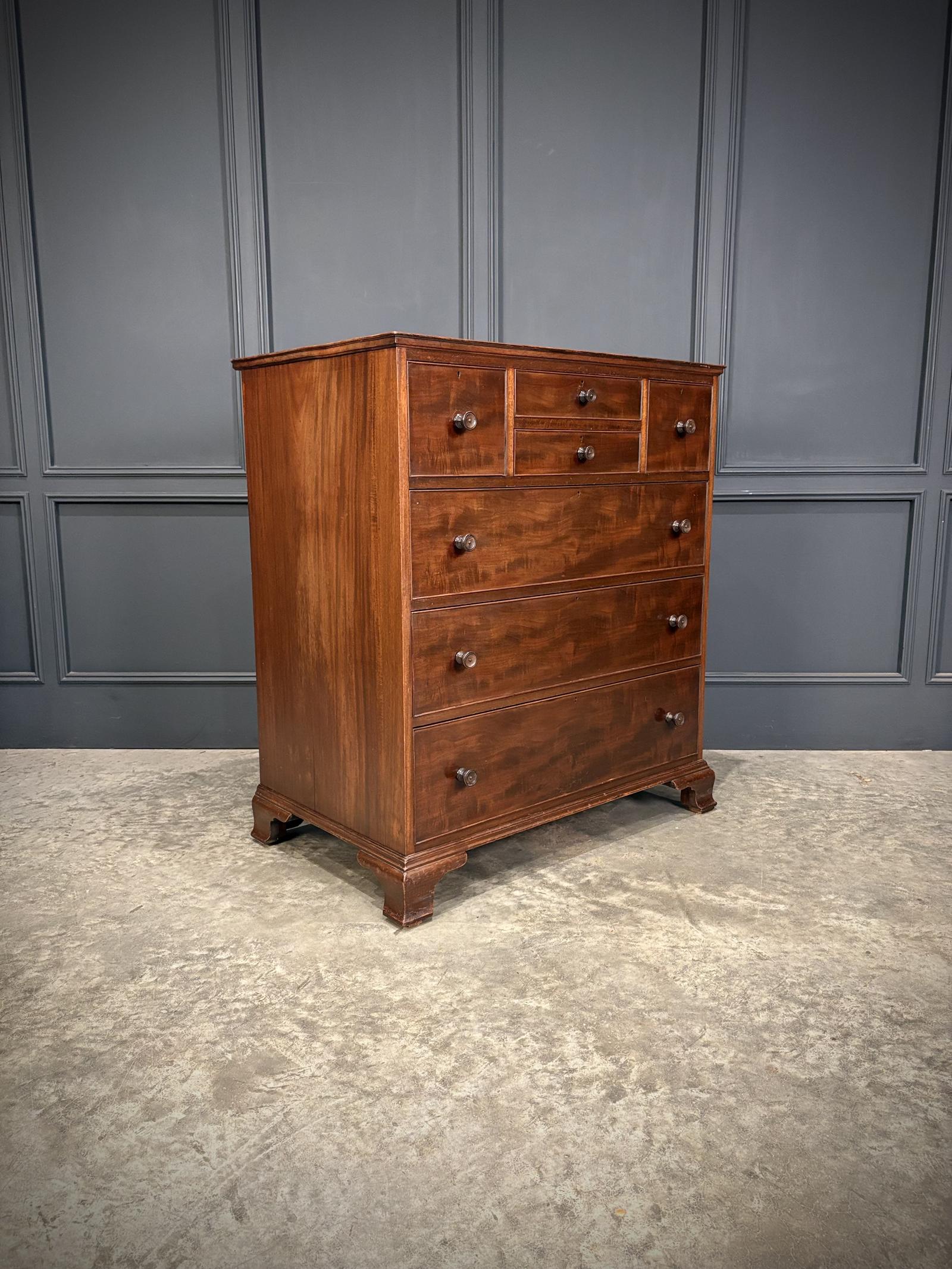 The solid mahogany top sits above an unusual configuration of four short drawers over three long graduating drawers, offering versatile storage.