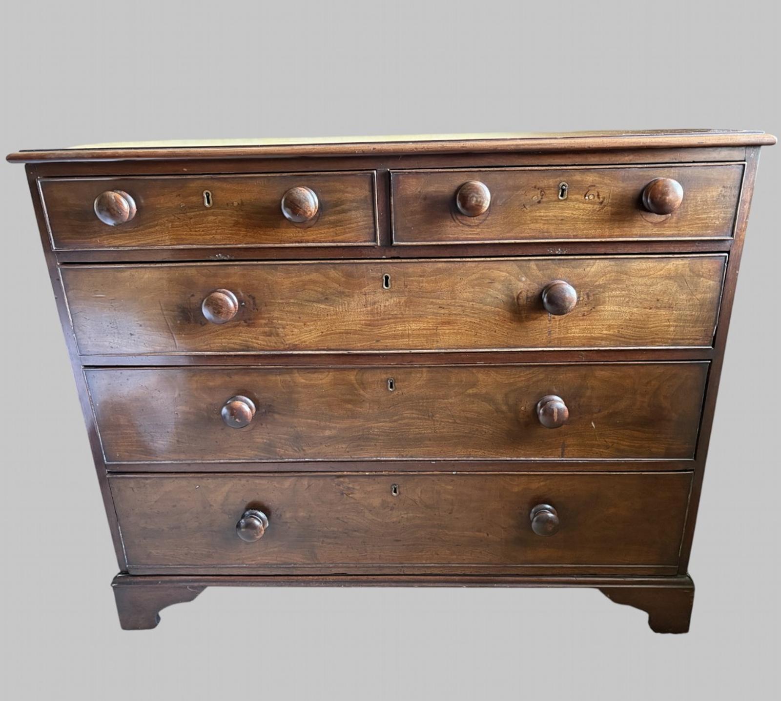 Late 19th Century Victorian antique mahogany chest of drawers with two short drawers over three long drawers with turned wooden knobs with slightly shaped bracket feet. It has honest wear some surface marks to top and patina consistent with age.