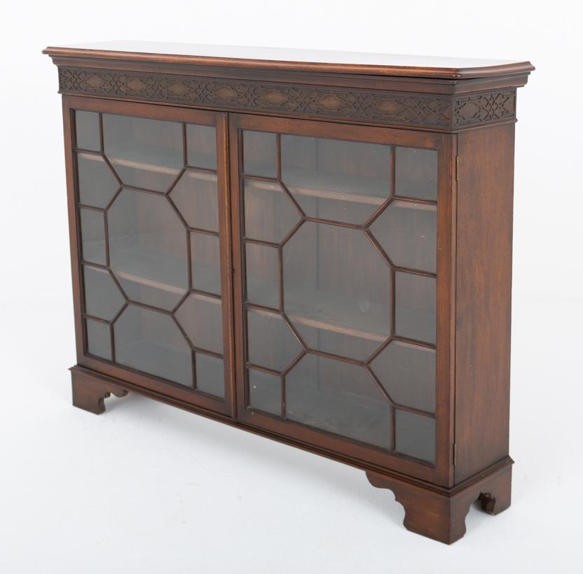 Offered for sale is this Georgian antique mahogany glazed side cabinet that is raised upon bracket feet. Featuring 2 astragal glazed doors which open to reveal 2 fully adjustable shelves. The frieze above being of a blind fretwork form.