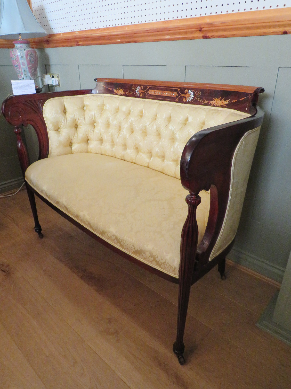 Mahogany Inlaid Sofa Deep Button Yellow Brocade c.1901