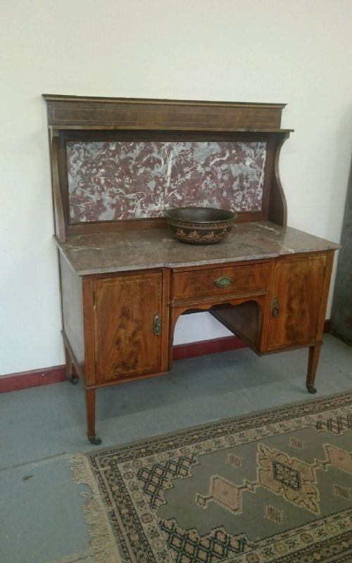 Mahogany & Inlay Edwardian Marble Topped Washstand with Marble Splash Back & Cupboards beneath