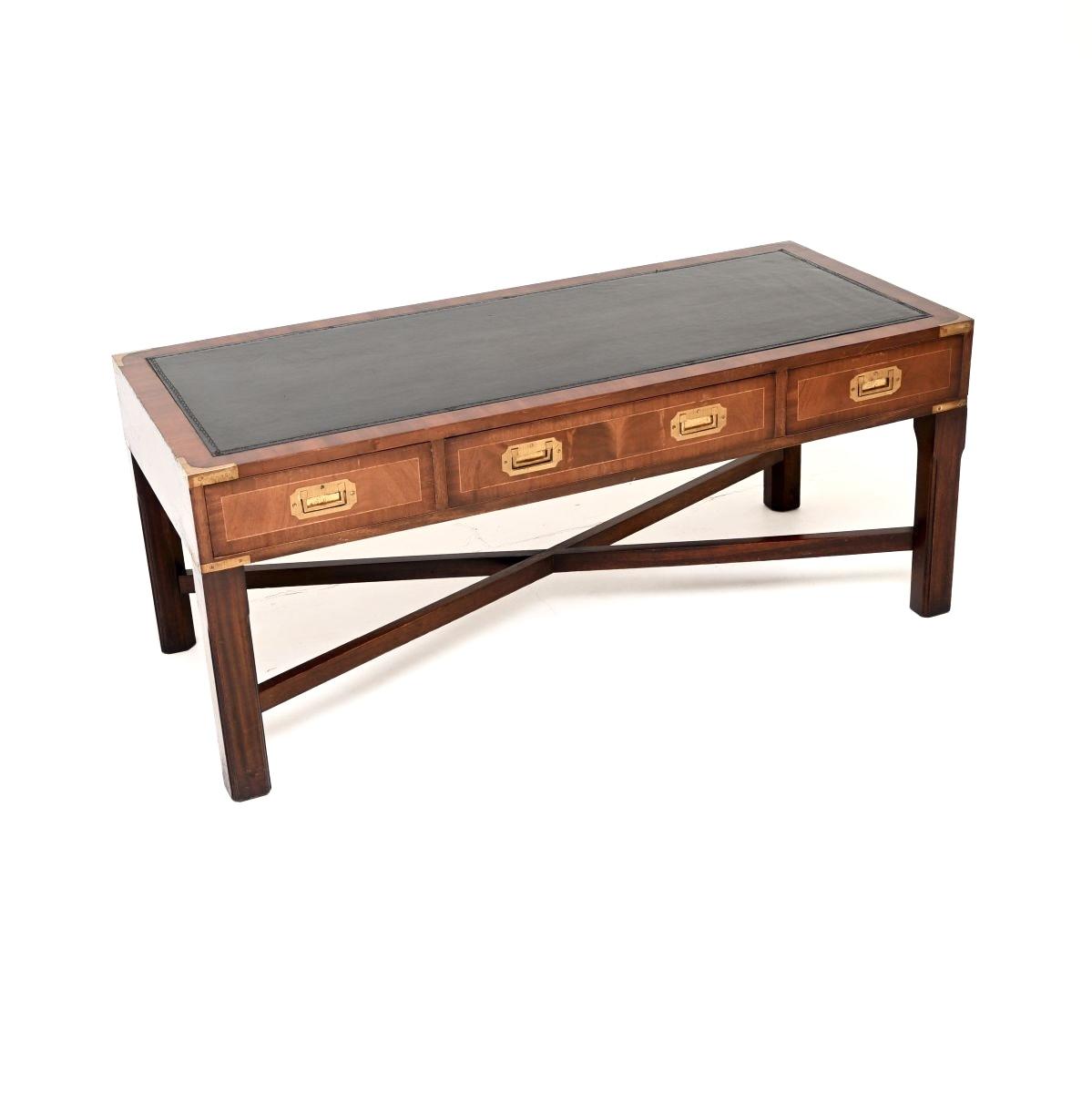 A fantastic mahogany military campaign style coffee table. This was made in England, we would date it from around the 1950s.