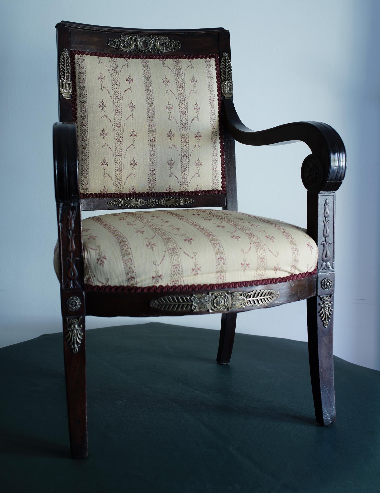 Mahogany Napoleonic and heavily mounted brass upholstered armchair.