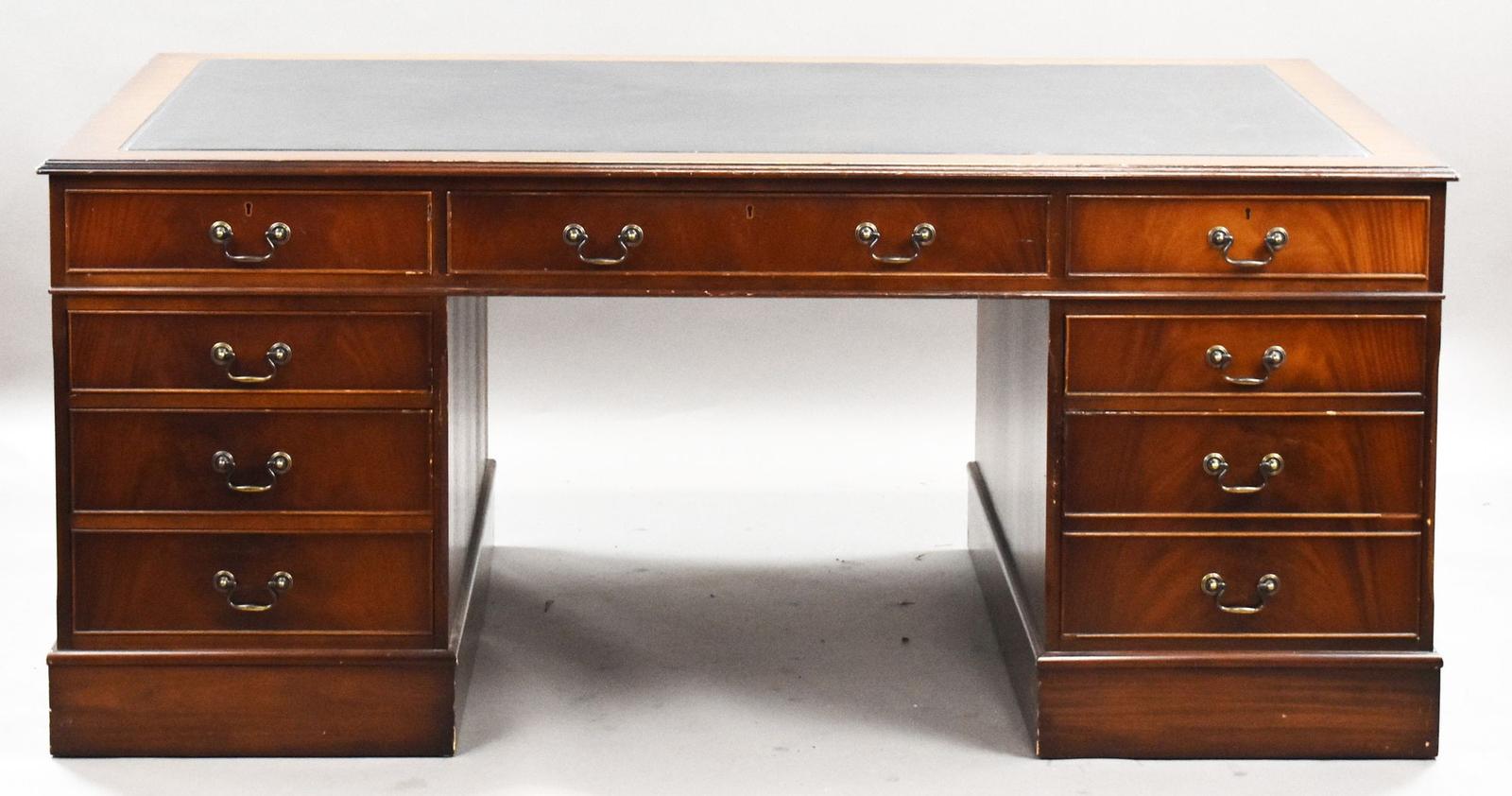A fine quality Edwardian style mahogany partners desk, of impressive proportions and classic form. The rectangular top with inset writing surface sits above an arrangement of drawers to both sides, allowing full use as a true partners desk. The rich mahogany displays attractive figuring throughout, complemented by traditional brass swan neck handles. Raised on substantial plinth bases, this piece offers both presence and practicality, ideal for a study, office, or statement workspace.