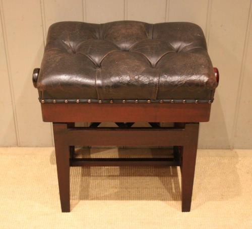 Mahogany piano stool having a buttoned leather seat , with turned wooden handles which can be used to adjust the height from 46 cm up to 55 cm high , raised on straight tapering legs . * Height46 cm / 18 1⁄4" * Width48 cm / 19" * Depth38 cm / 15 " Please note that not all items are on display in our showrooms and may be in our off-site store. If you wish to see specific items please notify us before visiting so that we can ensure the item(s) are available to view.